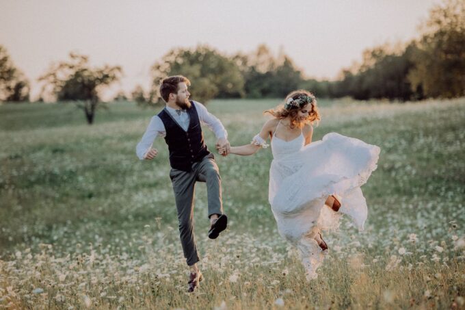 Umgekehrt kann auch aus der unerwarteten Situation das richtige Motiv entstehen. In diesem Fall stelle ich mir die Frage, was ich an diesem Ort gerade nicht erwarte. Ein Brautpaar mit Spaten und Mistgabel bei der Feldarbeit ist ebenso ungewöhnlich, wie eines das auf der grünen Wiese Ski fährt, auf der Mittelinsel einer Kreuzung mit Handzeichen den Verkehr lenkt, auf der Kirchenbank sitzend Eis isst (Pastor bzw. Pfarrer vorher fragen), mit Bierdose in der Hand auf einer Parkbank abhängt oder in der Straßenbahn die Ringe tauscht – der Phantasie sind keine Grenzen gesetzt.