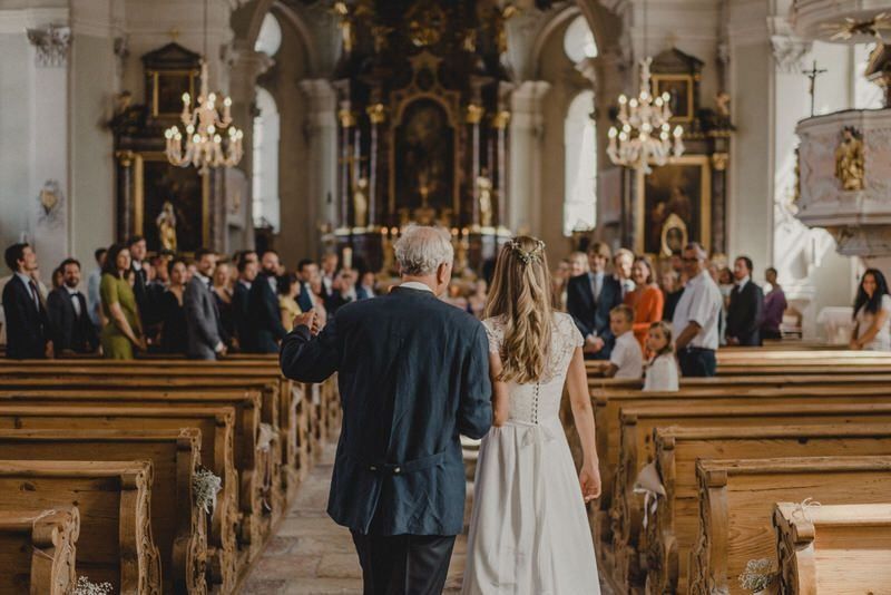 Der Einzug ist wohl einer der emotionalsten Momente der Hochzeit. Der Bräutigam steht vorne am Traubogen oder Altar und sieht seine Liebste auf sich zu schreiten. Ihr seht einander vermutlich zum ersten Mal an Eurem besonderen Tag und realisiert so richtig: “Wow, wir heiraten jetzt!”.