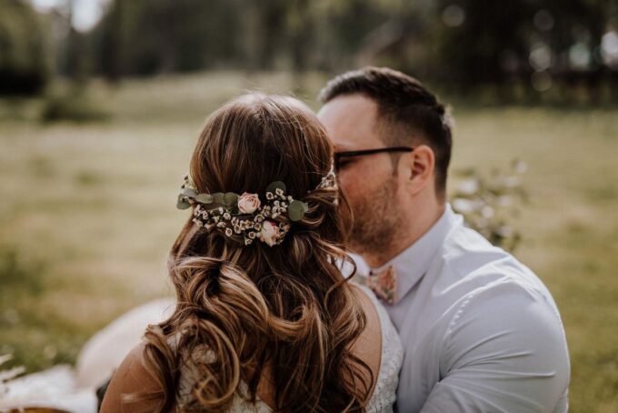 Auch eine halboffene Brautfrisur kann unglaublich toll aussehen und ist auch sehr beliebt bei Boho Hochzeiten in Verbindung mit Blumenkränzen oder anderen Accesoires. Hier gibt es auch unzählbar viele Varianten dieser Hochzeitsfrisur, von einem Flechtkranz bis hin zu einem Mini-Dutt aus zwei geflochtenen Strähnen.