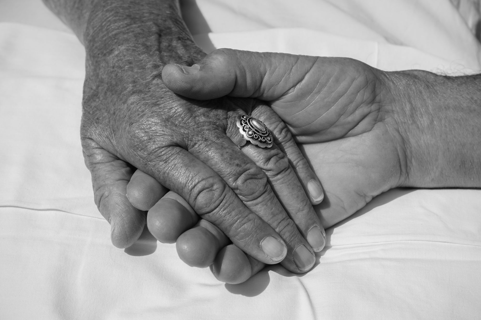 Eine ältere Frau hält die Hand eines älteren Mannes.