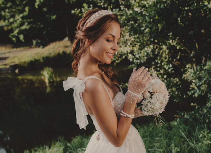 Der Abendhandschuh (auch Opernhandschuh genannt) erlebte bereits vor einigen Jahren auf Runway-Shows ein Comeback, wie zum Beispiel auf der von Gucci. Nun haben sich die Handschuhe auch in der Brautmode durchgesetzt und werden durch Perlen oder Personalisierungen mit den Initialen modernisiert. Gerade auf Bildern sind sie ein tolles Accessoire. Dabei machen Bräute kein Unterschied ob die Handschuhe für eine freie Trauung, eine kirchliche Trauung oder das Standesamt ist – Handschuhe sind die absolute Trendwahhl für das Jahr 2023.