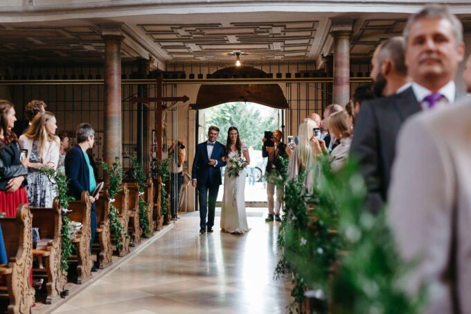 Die kirchliche Trauung ist deutlich weniger intensiv, was die Dokumente angeht, im Vergleich zum Standesamt. Alles, was Ihr braucht, ist die Bescheinigung, dass einer von Euch in der Kirche Mitglied ist, dass Ihr Euch schon standesamtlich habt trauen lassen (Eheurkunde) und natürlich die Personalausweise.