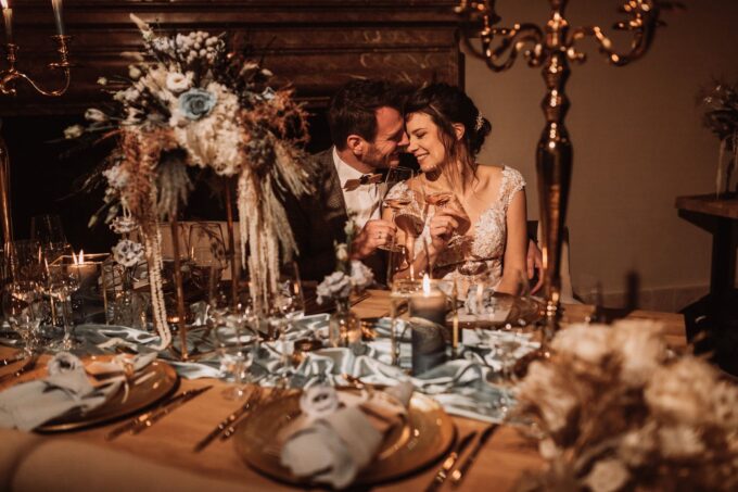 Die Tischdeko passt ebenfalls wunderbar zu dem Motto der Loho-Hochzeit und ist, wie wir finden, etwas ganz Besonderes. Die goldenen Elemente, die großen Kronleuchter und noch der Kamin machen diesen Tisch einfach zu einer Traum-Hochzeitstafel. Der üppige Blumenstrauß rundet die Tafel wunderbar ab und stellt einen tollen Hingucker dar. Auch hier wurde mit hellen Blautönen, wie beispielsweise bei den Servietten und dem seidigen Tischtuch, gearbeitet, die tolle Farbtupfer darstellen.