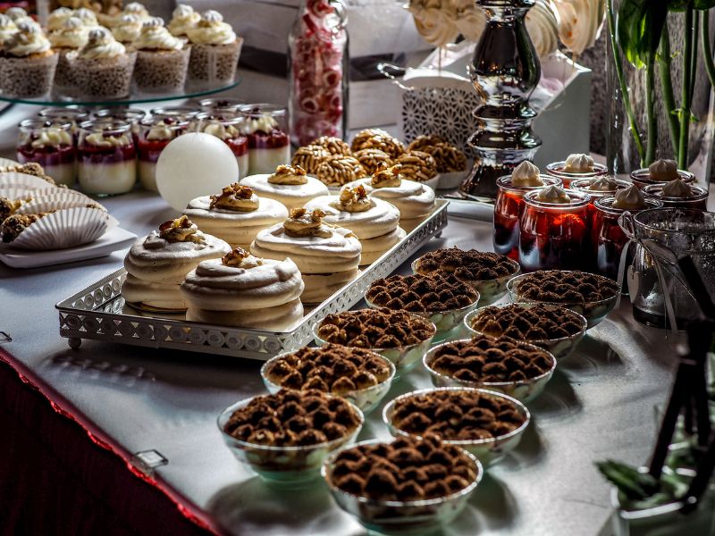 Ein Dessert-Buffet mit einer Auswahl an kleinen SĂŒĂigkeiten und GebĂ€ckstĂŒcken ist ein krönender Abschluss der Feier. Es bietet eine sĂŒĂe Ăberraschung und ist bei GĂ€sten jeden Alters beliebt. Von Mini-Cupcakes ĂŒber Macarons und Schokoladen-Eclairs bis hin zu ObstspieĂen und Mousse au Chocolat â die Möglichkeiten sind nahezu unbegrenzt.