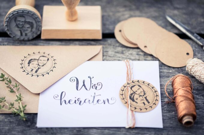 Das klassische Einsatzgebiet für Hochzeitsstempel sind natürlich die Hochzeitseinladungen. Hier könnt Ihr z.B. die Briefumschläge bestempeln und den Stempel als Siegel benutzen. Oder aber Ihr bastelt Banderolen oder verziert blanko Anhänger oder Aufkleber und nutzt diese als Designelement & Highlight für Eure Einladungskarten. Aufpassen solltet Ihr bei der Wahl des Papieres bzw. der Stempelfarbe. So kann es beispielsweise passieren, dass die Stempelfarbe auf beschichteten Papieren und Karten leicht verwischt und nur langsam trocknet. Hier eignet sich schnell trocknende Stempelfarbe (z.B. von StazOn), welche für glatte Oberflächen geeignet ist.
