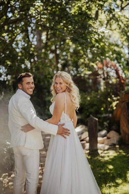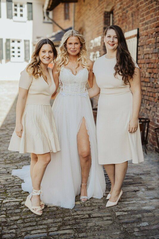 Constanze trägt ein wunderschönes Brautkleid aus Softtüll und romantischem Rückenausschnitt. Die Schnürung an der Seite sorgt für einen Hauch Sexiness. Der elegant sportliche Anzug von Gian-Luca passt sich hervorragend dem Motto an. Der Beigeton wirkt elegant und sommerlich. Auch die Brautjungfern tragen sommerliche Kleider in Beige. Ein abgestimmter Look für die Hochzeit im Golden Italian Glam Look gepaart mit dem Boho Stil.
