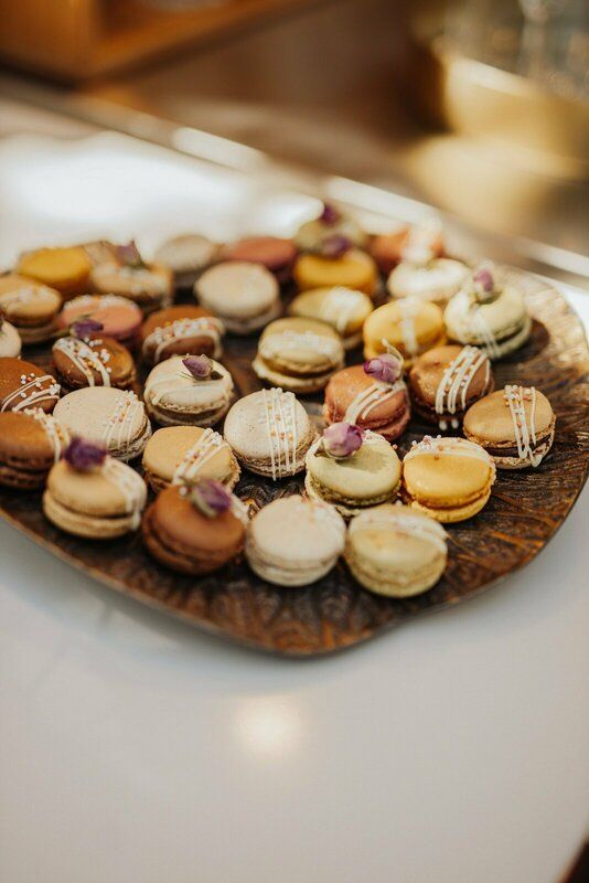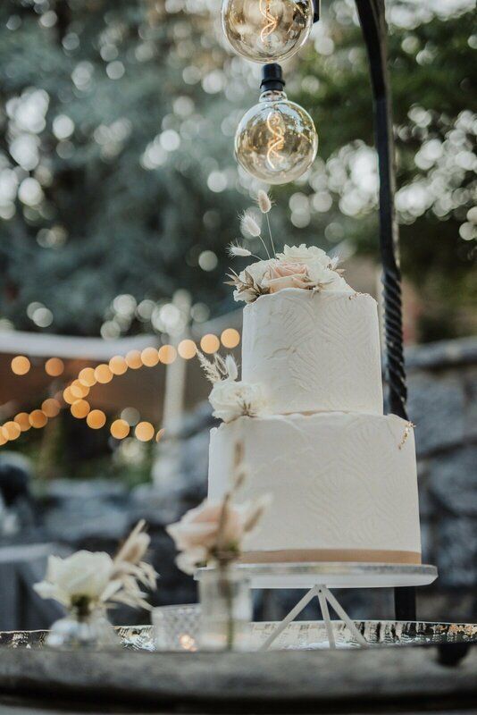 Um die lockere Atmosphäre erneut zu unterstreichen wurde die Hochzeitstorte und der Sweettable an einen anderen Ort des Gartens verlegt. Die Hochzeitstorte hat ein Buttercremefinish und wurde mit frischen Blüten geschmückt, dies verleiht zusätzlich Eleganz im Bohostil. Zusätzlich wurden Cheesecake- Törtchen und Macarons gereicht.