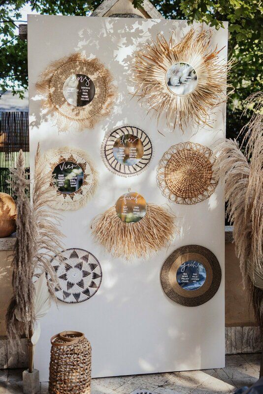 Der Boho Vibe spiegelt sich in der gesamten Deko wider. Es wurden Trockenblumen mit Bast kombiniert. Der Tischplan wurde auf runden Spiegelelementen kalligrafiert, die mit Bastgeflecht umrandet sind. Eine total coole Idee!