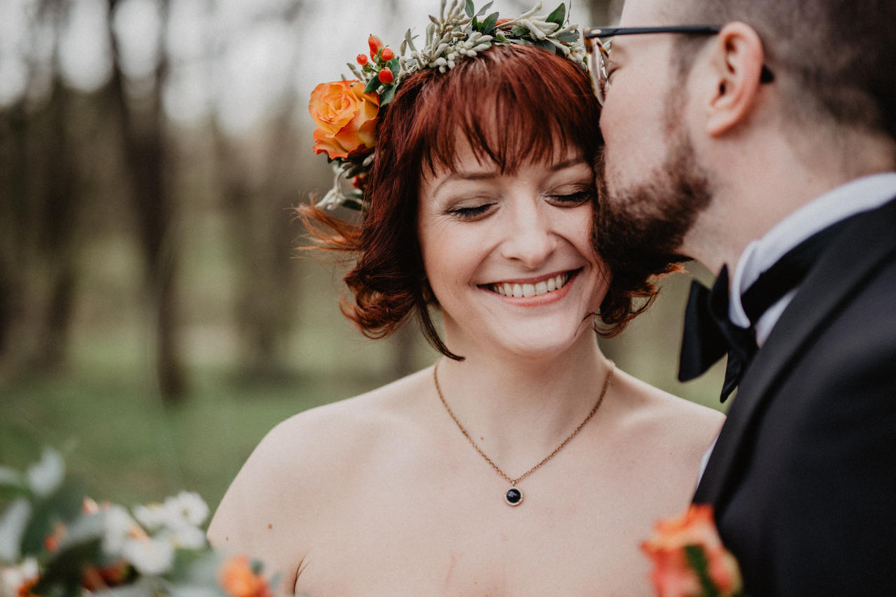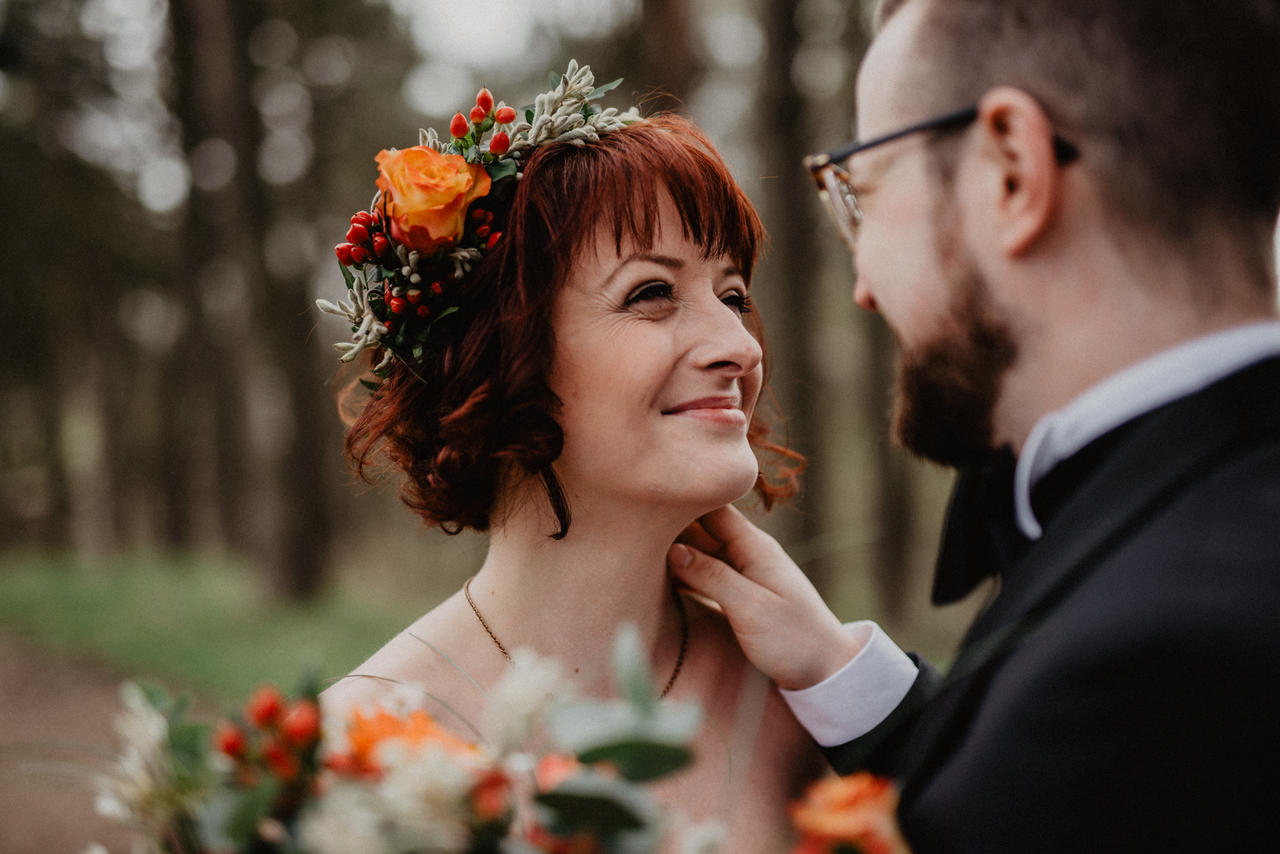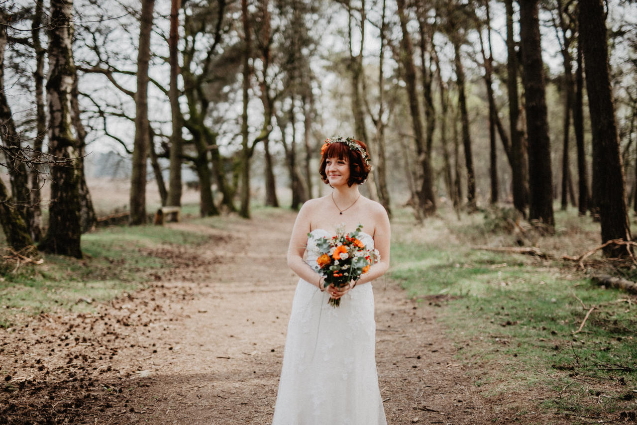 Katharina nahm ihr Styling selbst in die Hand und trug ihr ehemaliges Brautkleid von der Marke "Sincerity". Die Blumen und auch den blumigen Kopfschmuck entwarf Nicole Neumann von der Gärtnerei Klumpen und hat damit Katharinas Art total auf den Punkt gebracht. Der Strauß ist sehr fröhlich, farbenfroh und ein echter Hingucker.