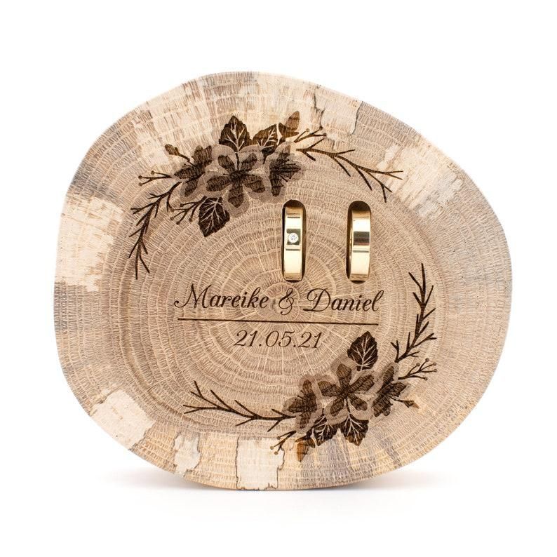 Eine weitere tolle Alternative ist die Ringscheibe, diese ist oftmals personalisiert mit Eurem Namen und Hochzeitsdatum. Das bringt nochmal einen ganz persönlichen Touch in Eure Hochzeit. Meistens ist die Ringscheibe aus Holz, in Form eines Baumstamm Querschnittes oder aus Resin. Beide Materialien haben eine schöne Oberfläche und somit eine angenehme Haptik.