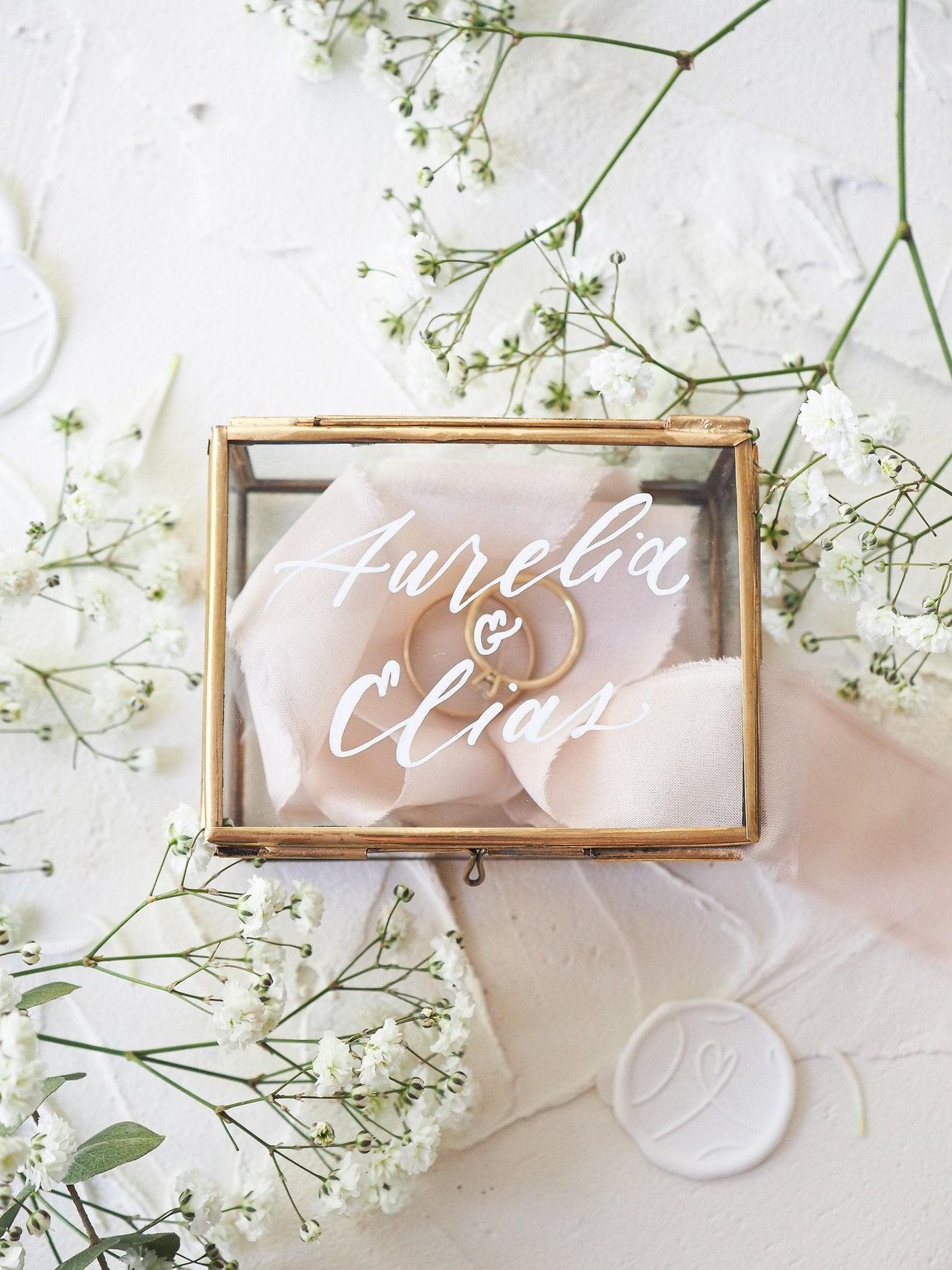 Ein Ringkästchen ist eine sehr trendige und moderne Variante. Oftmals sind Ringboxen aus Glas, können aber auch aus Holz oder Metall sein. Es gibt sie in vielen verschiedenen Ausführungen, ob im Vintage Look, industrial oder orientalisch. Wählt das Design was am Besten zu Eurer Hochzeit passt. Der Vorteil einer Ringbox aus Glas ist, dass man je nach Größe viele unterschiedliche Inhalte wählen kann. Zum Beispiel frische und getrocknete Blüten oder Stoff wie Samt oder Satin.