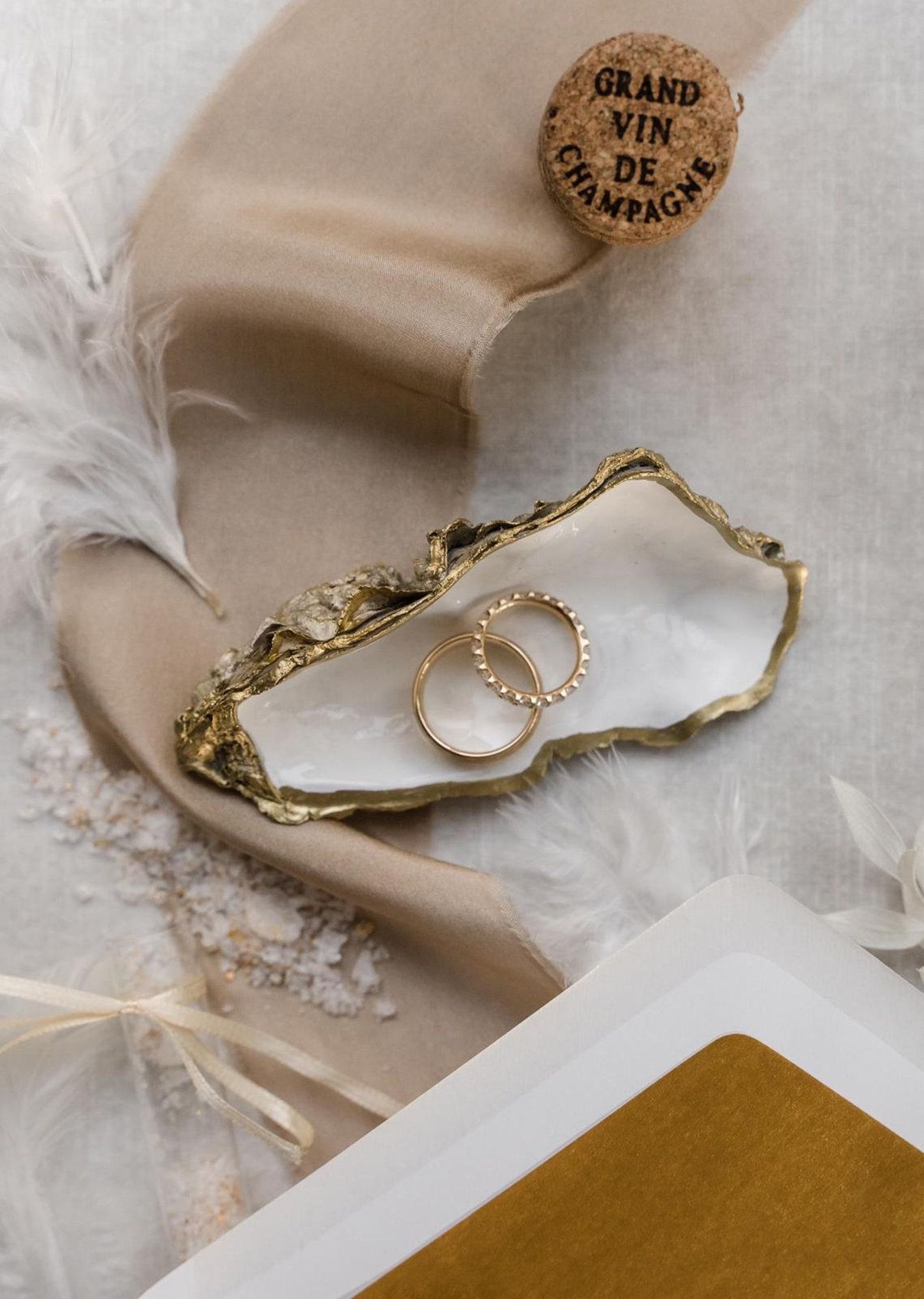 Eine Ringschale kann ein bestimmtes Hochzeitsmotto besonders gut unterstreichen. Habt Ihr beispielsweise eine Strand-Hochzeit, eignet sich eine Muschelförmige Ringschale besonders gut. Auch hier könnt Ihr die Farbe passend zum Konzept der Hochzeit wählen.