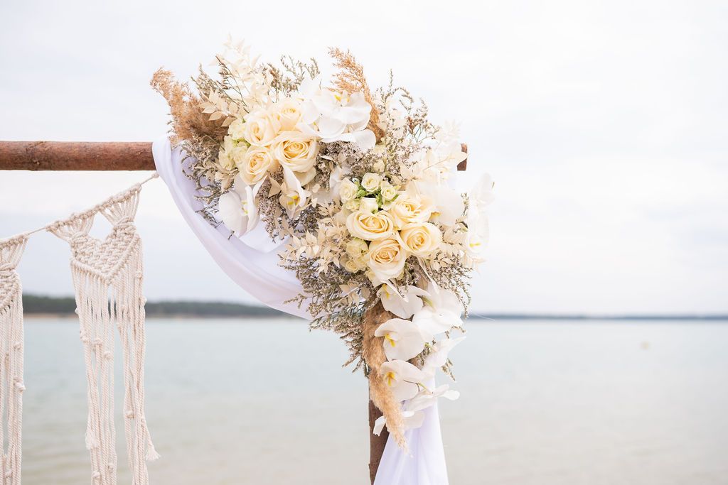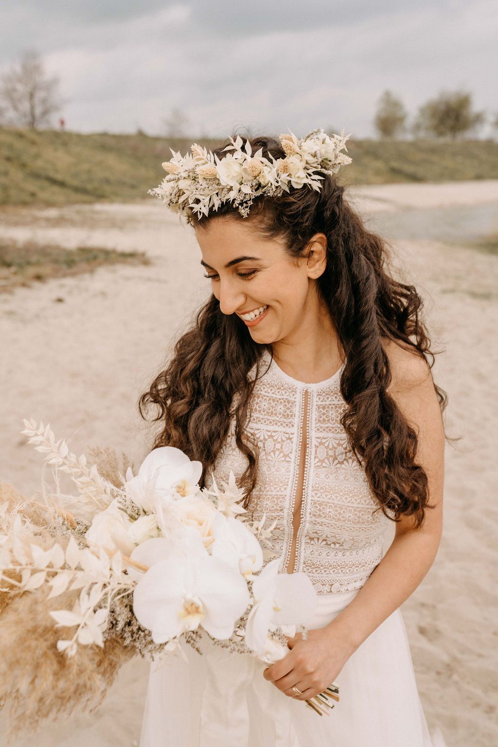 Der Blumenschmuck in seinen Naturtönen harmoniert perfekt mit dem Farbmotto creme und weiß. Treu dem Boho Motto wurden Trockenblumen mit cremefarbenen Rosen und Orchideen kombiniert. Der Brautstrauß und der Blumenkranz geben einen verspielten und gleichzeitig romantischen Look, ein Traum!