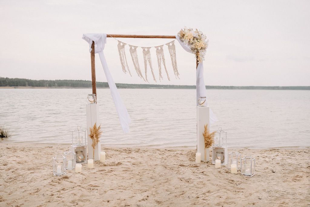 Der Traubogen aus Holz integriert sich mit seiner Natürlichkeit perfekt in die malerische Kulisse der Partwitzer Seen. Er wurde mit zartem Tüll und einer Makramee Girlande in Cremetönen geschmückt, die vom leichten Winde verweht werden. Große Kerzen und Laternen zieren den Weg zum Traubogen. Einfach wunderschön!