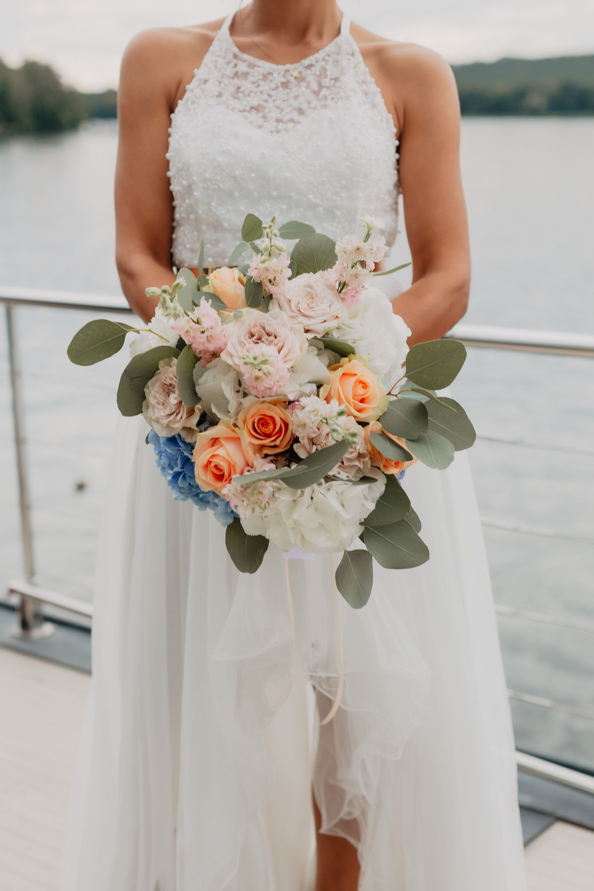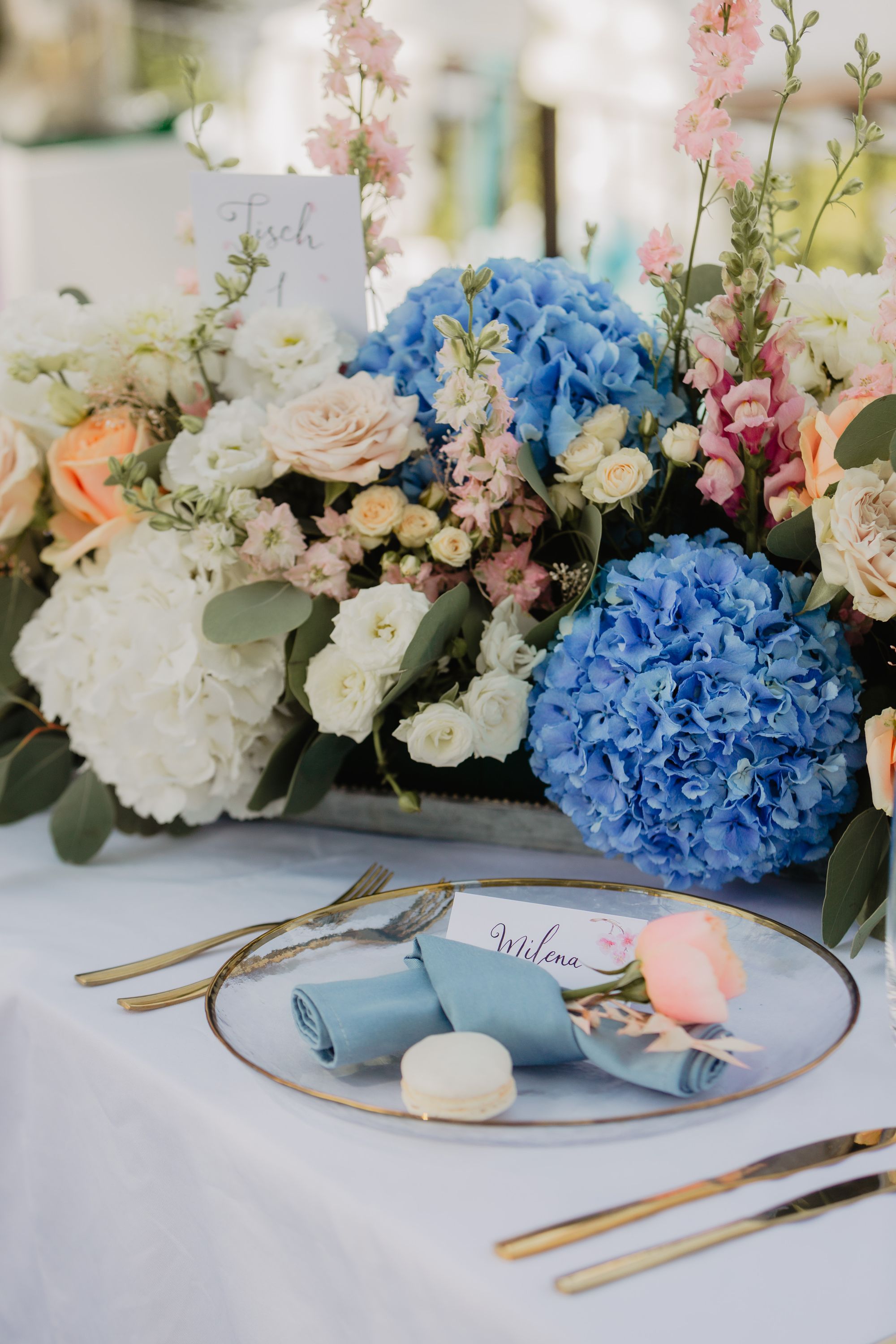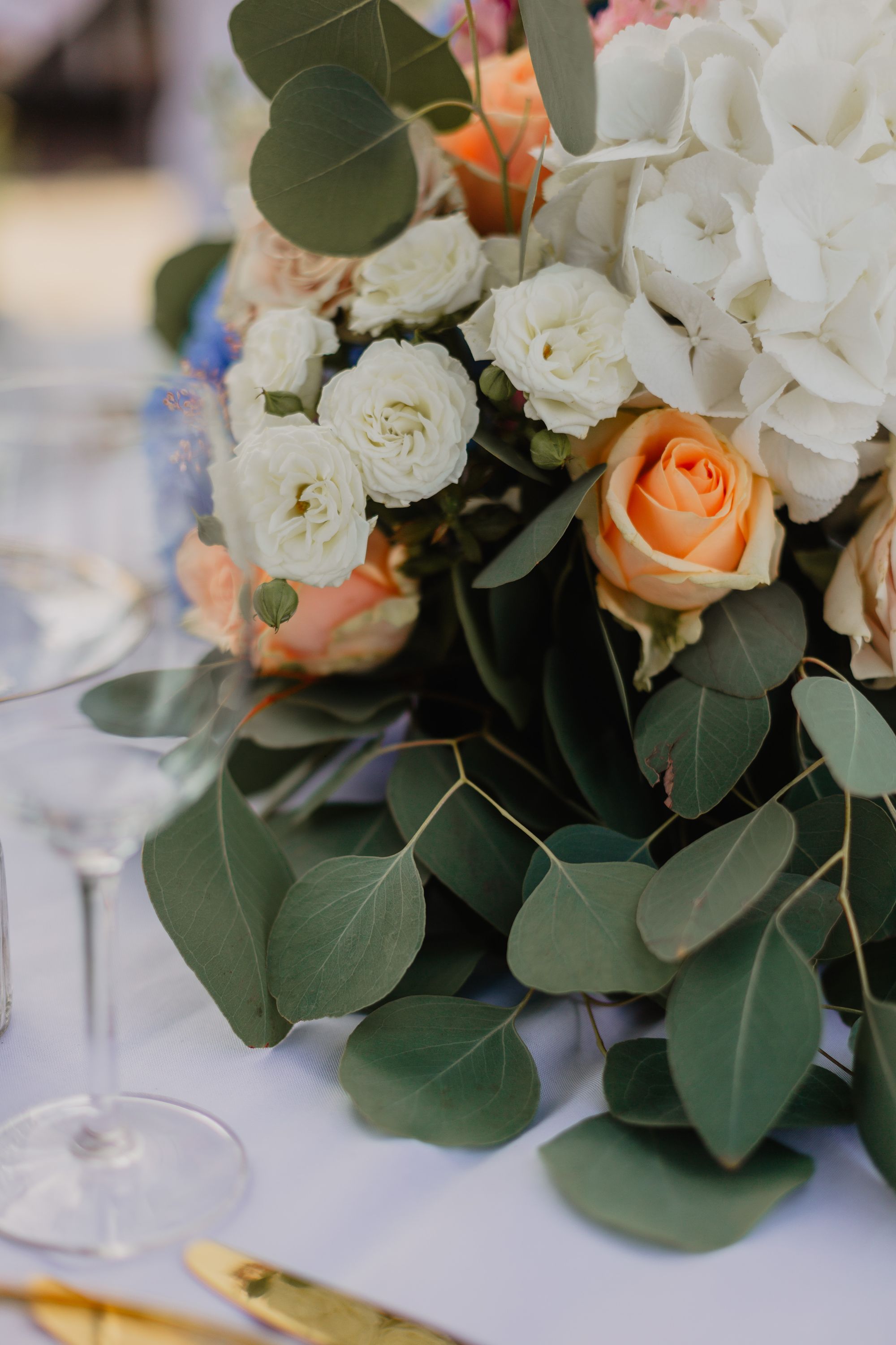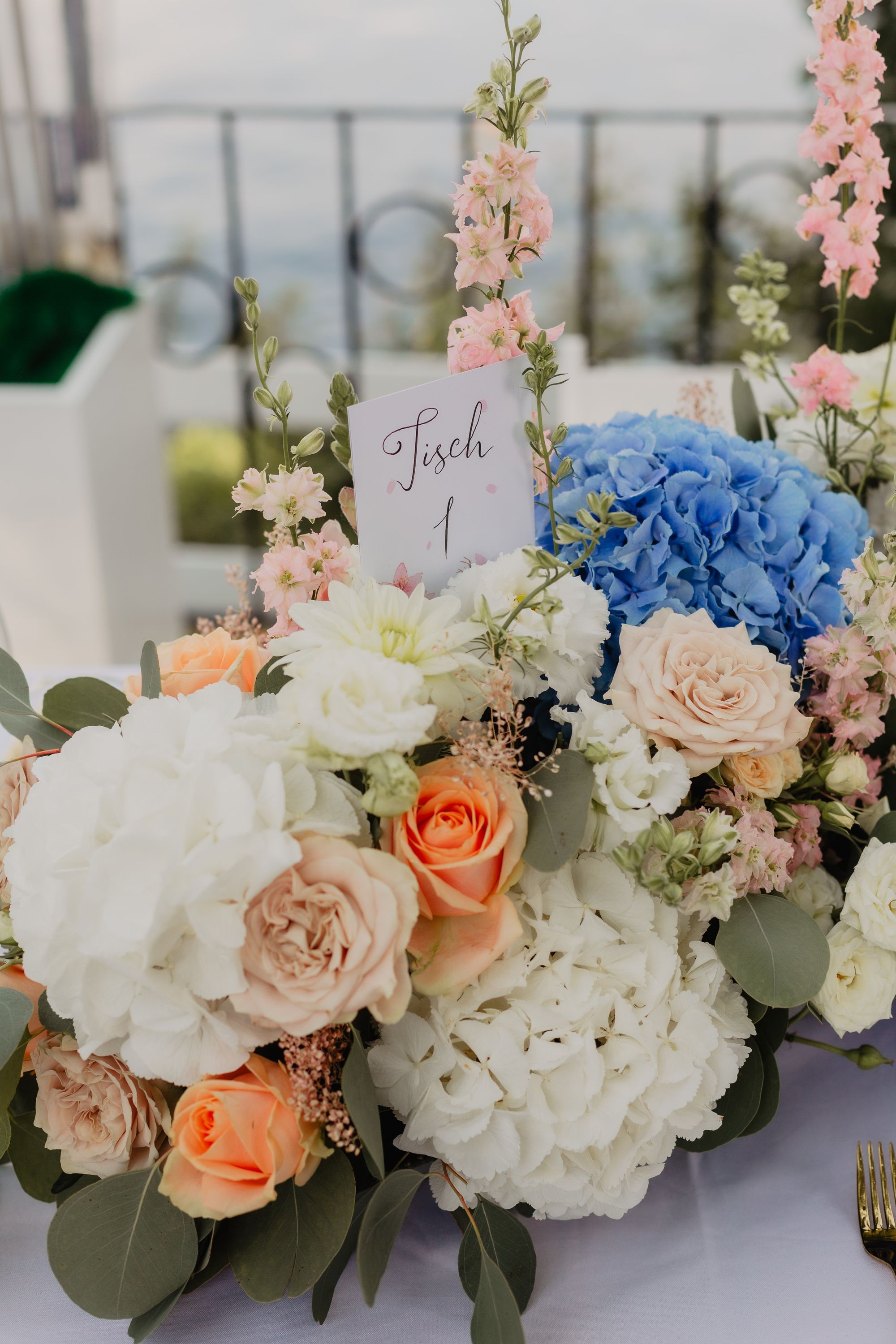 Eleganter Blumenschmuck aus Hortensien, Rosen und Eukalyptus sorgen für den sommerlichen Touch. Auch hier wurde das Thema Sommerhochzeit am See durch die majestätisch blauen Hortensien aufgegriffen, besonders schön finden wir die Kombination mit den Rosa-Orangen Blüten.