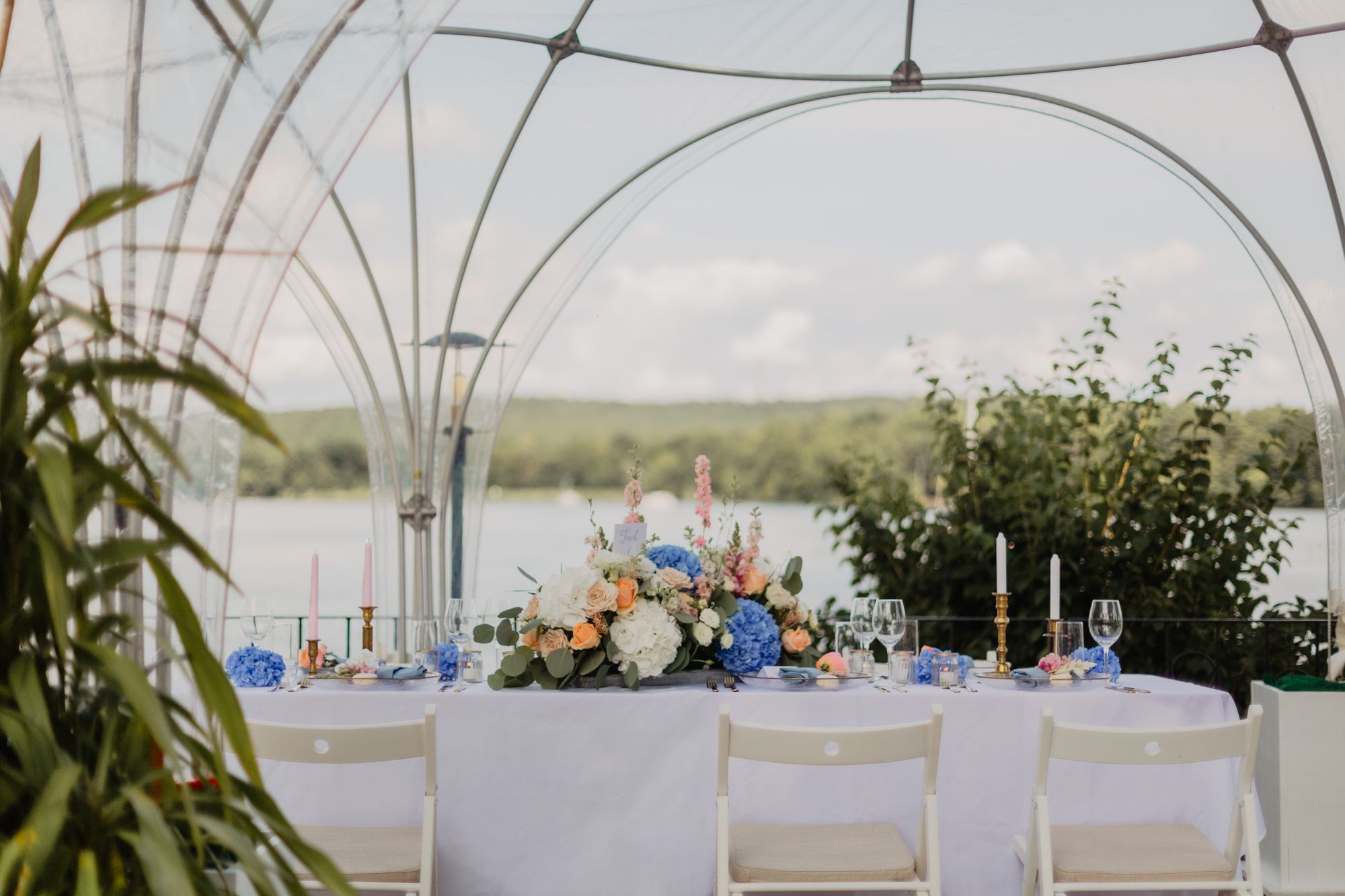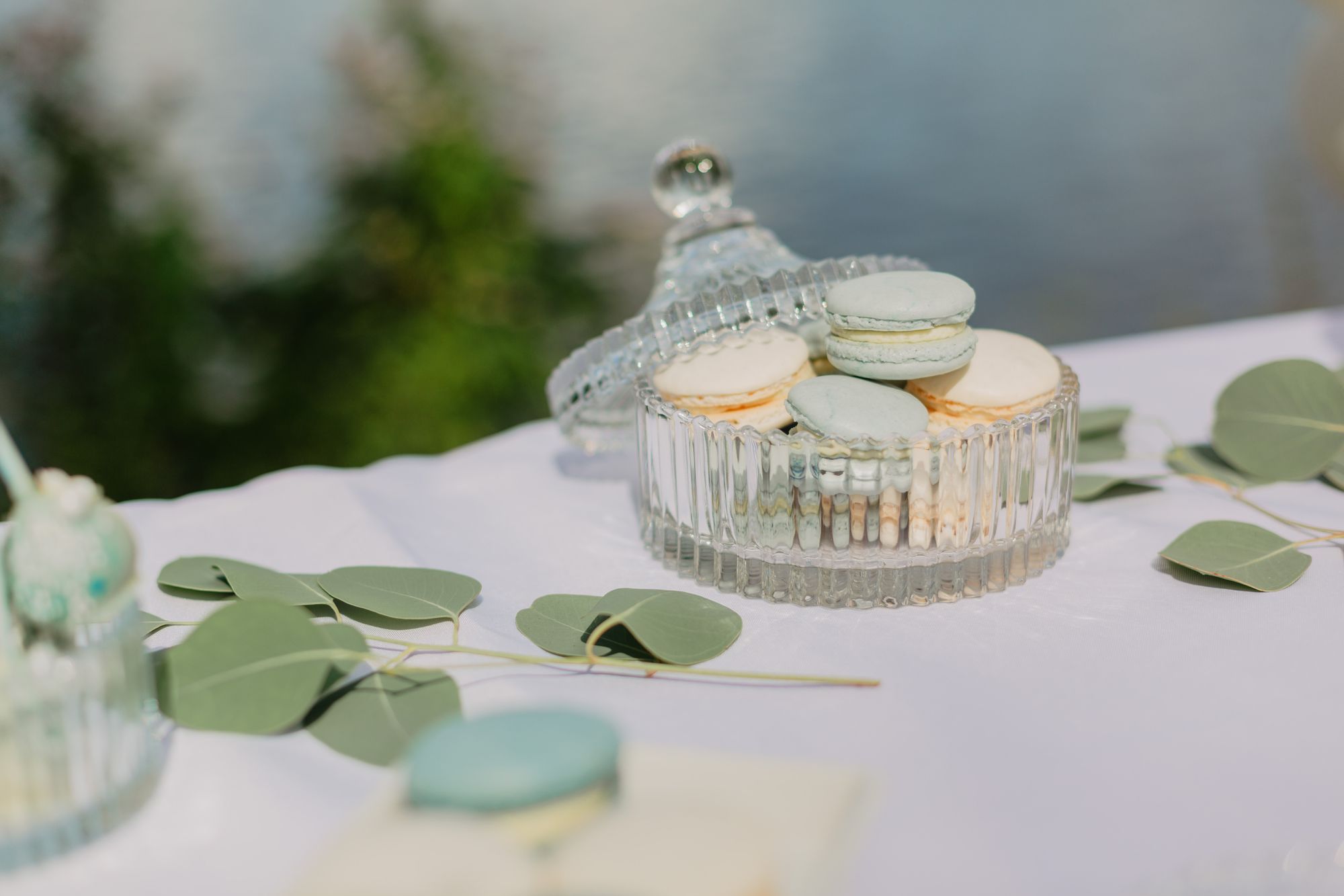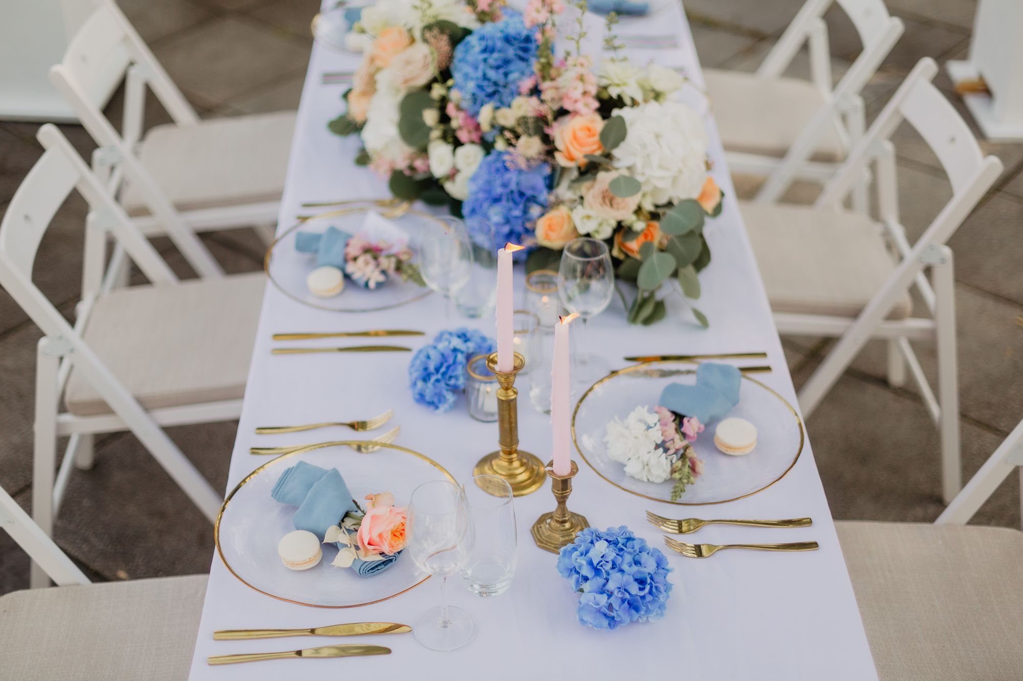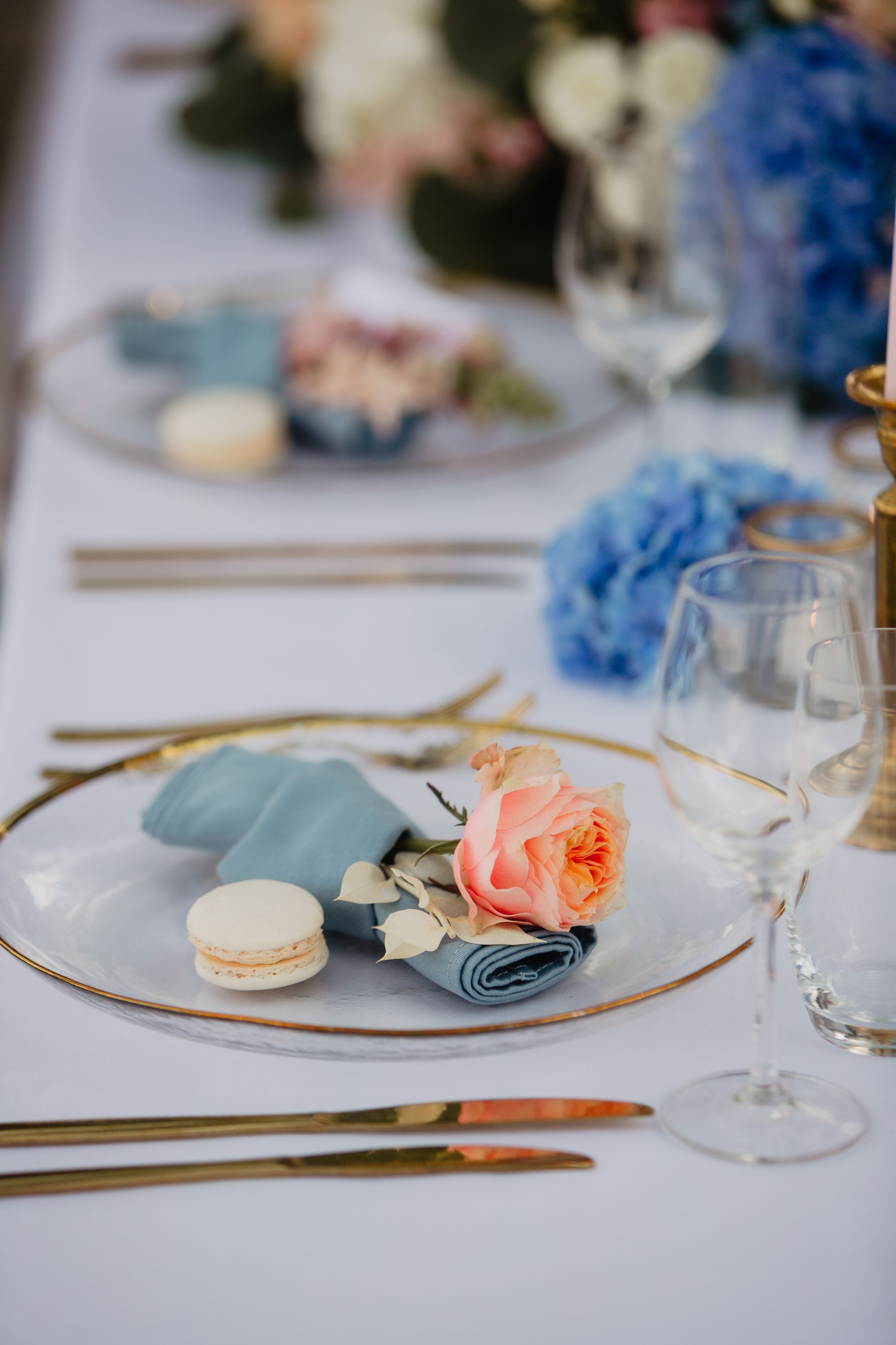 Eine wunderschöne Tafel direkt am See! Für die Tafel wurde ein weißes Tischtuch gewählt, welches perfekt zum Stil passt, und dem ganzen einen cleanen Look verleiht. Das Farbkonzept aus Blau-, Rosa- und Cremetönen findet sich in der Tischdekoration wider. Die hohen Kerzenständer verleihen in Kombination mit den anderen Goldakzenten pure Eleganz. Das Tafelservice besteht aus tollen Glastellern mit goldenem Rand. Das Kerzenlicht sorgt in späterer Stunde für romantische Stimmung. Die kleinen Macarons sind eine tolle Aufmerksamkeit für jeden Gast.