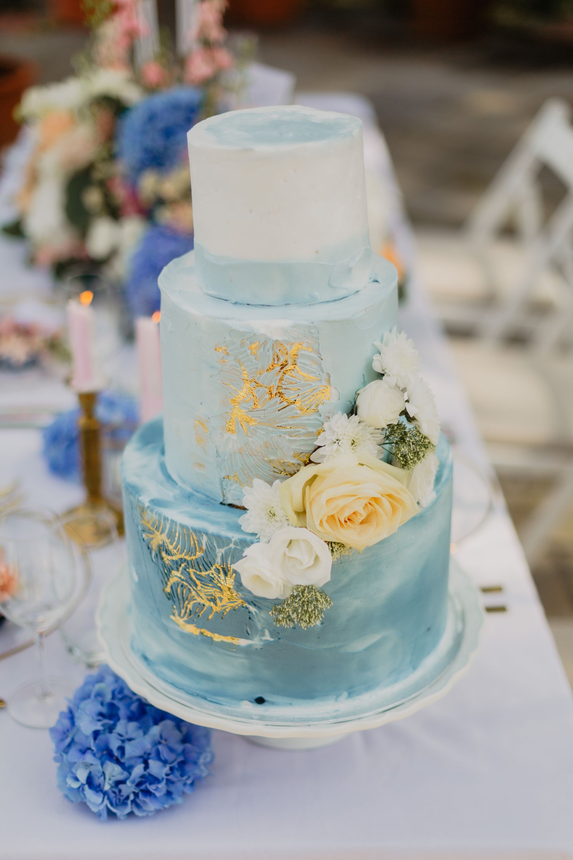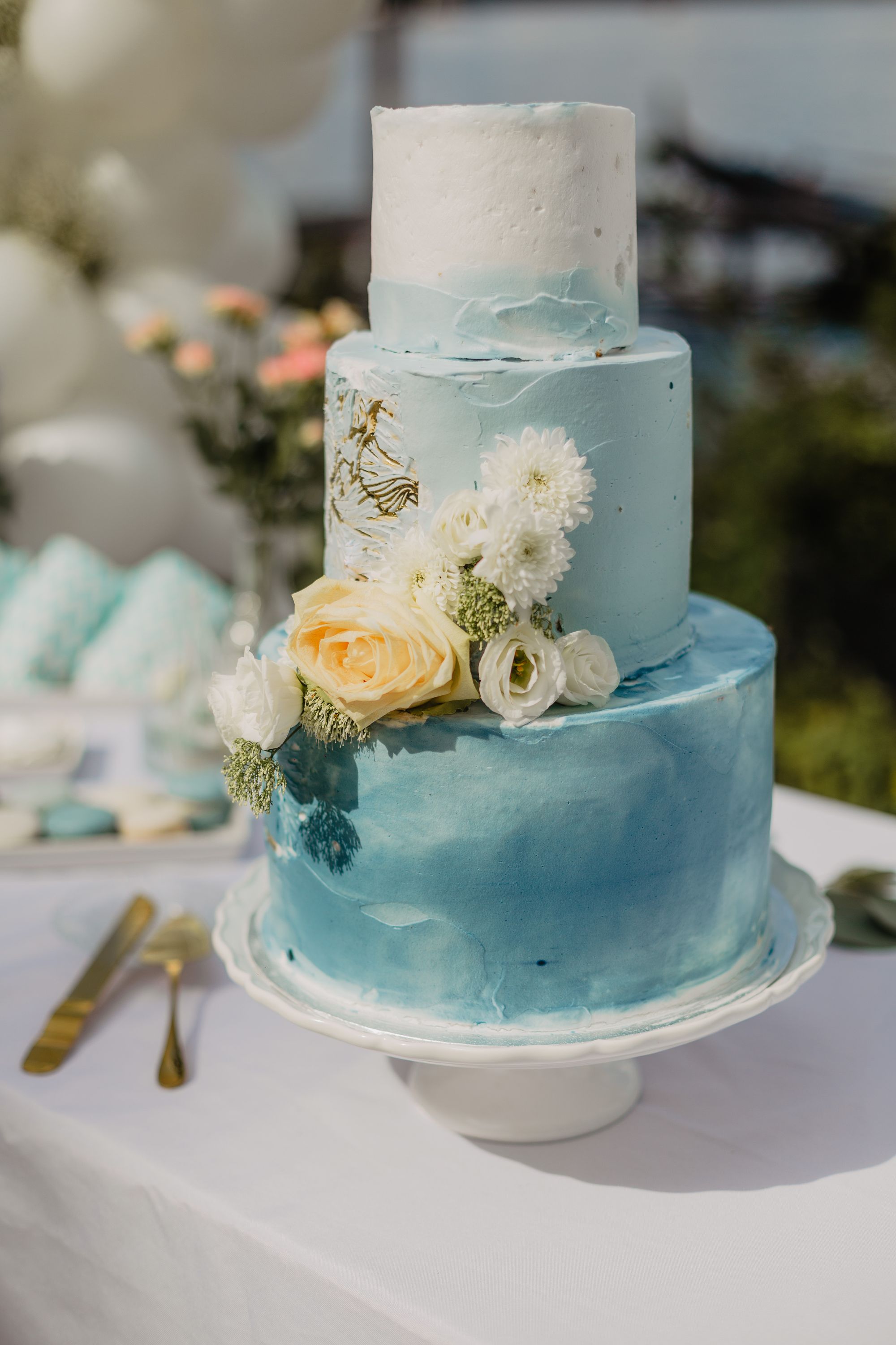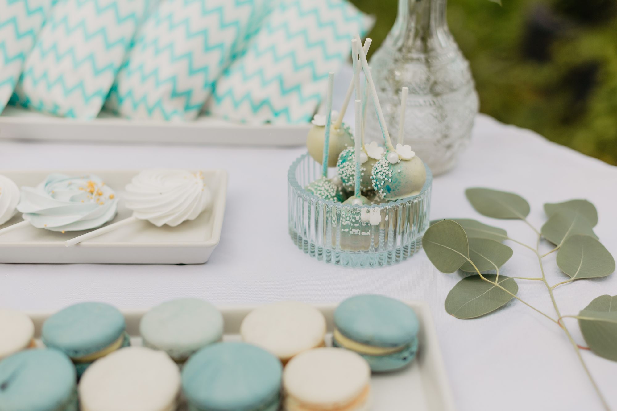 Besonders angetan sind wir von der modernen Hochzeitstorte. Eine wundervolle Torte die mit Buttercreme in Blautönen verkleidet wurde. Die Akzente aus Blattgold sind ein echter Hingucker! Echte Blüten sorgen für die Eleganz. Zusätzlich wurden Macarons, Cake Pops und verziertes Baiser in den selben Farbtönen sehr ansprechend in kleinen Gläschen und auf schönen Servierplatten drapiert, die zum zugreifen einladen. Einfach himmlisch!