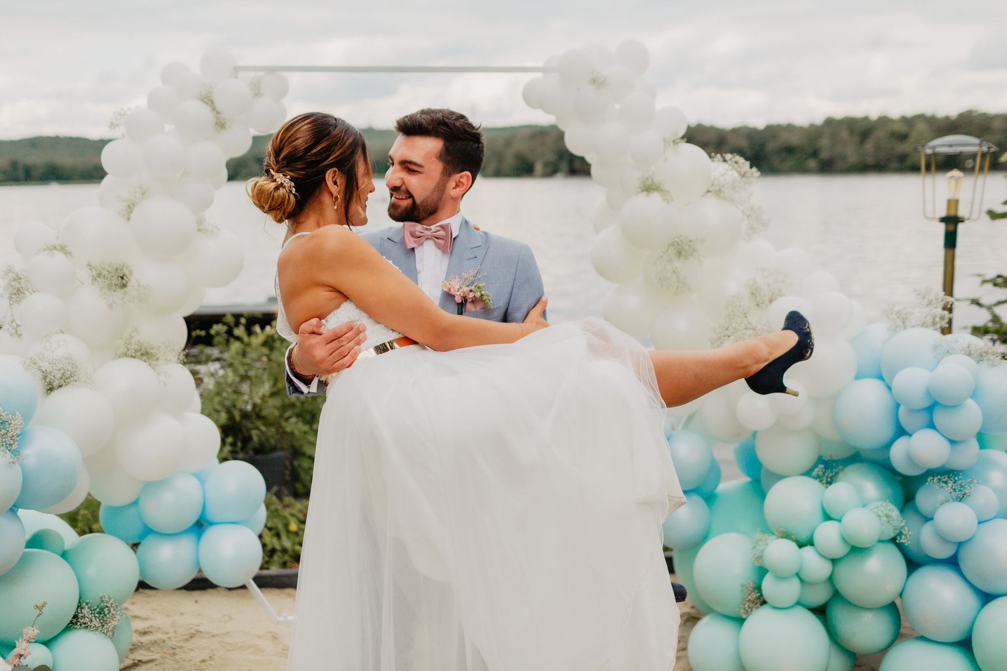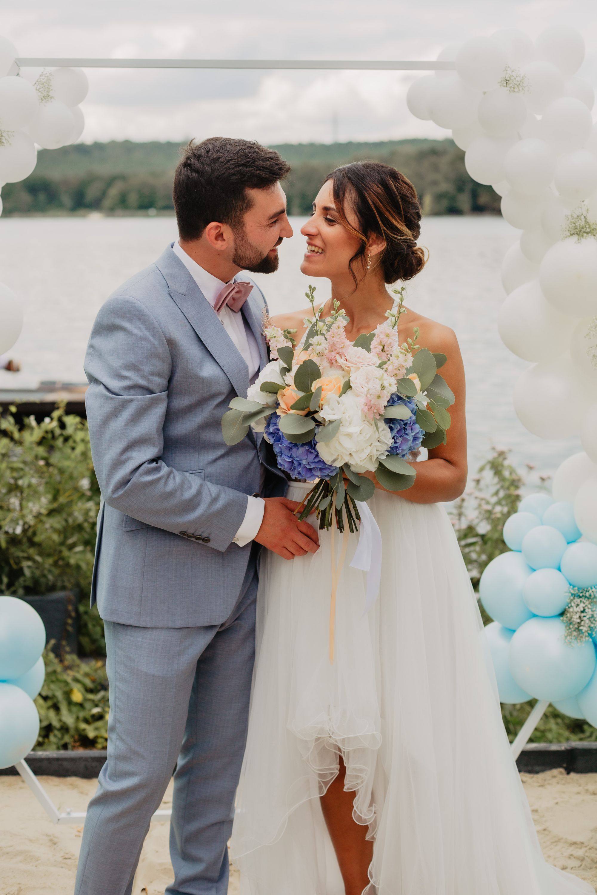 Bei einem romantischen Brautpaarshooting wurden wunderschöne Momente festgehalten. Treu dem Motto Sommerhochzeit am See trägt die Braut ein luftig fallendes Vokuhila Kleid aus Tüll und Spitze. Der Bräutigam strahlt in einem modernen graublauen Anzug mit Rosa Fliege. Der Hochzeitsanstecker in Rosatönen findet sich im Brautstrauß wieder. Luftballone in Creme und Blau unterstreichen die tolle sommerliche Kulisse am See, und sorgen für eine fröhliche Atmosphäre.
