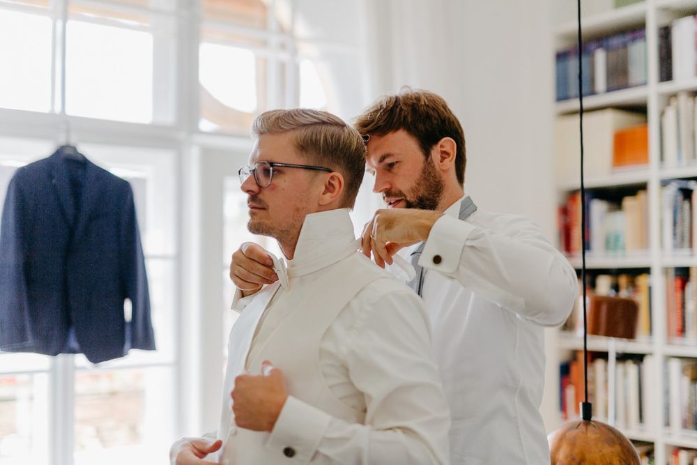 Und natürlich gilt das auch für den angehenden Bräutigam. Normalerweise werden diese durch ihre Freunde und Trauzeugen bei der Auswahl des richtigen Hochzeitsanzuges begleitet.
