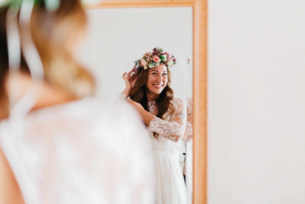 Die Braut trägt eine halboffene Hochzeitsfrisur.