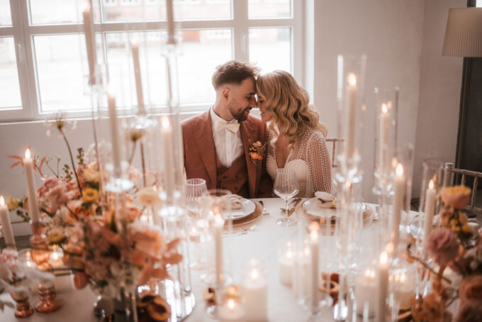 Ein Paar steht in einem gut beleuchteten Raum mit großen Fenstern neben einem dekorierten Esstisch mit großen Kerzen und Blumenarrangements.