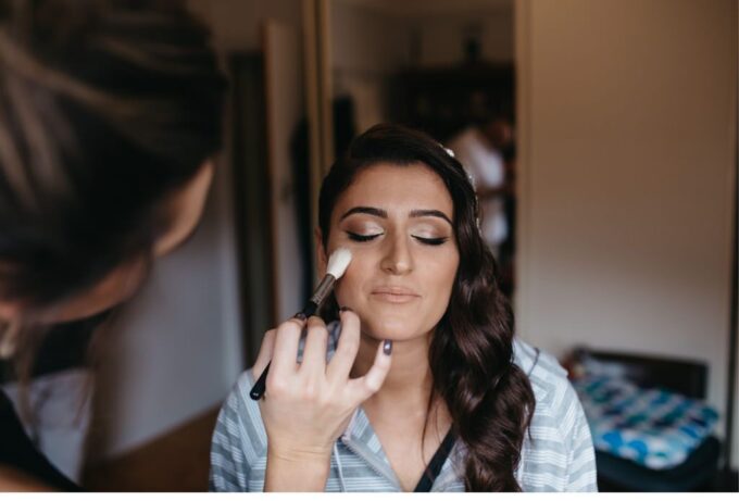 Puder ist besonders wichtig, wenn Du eine ölige Haut hast oder in einem heißen Klima heiratest. Aber auch wenn Du trockene Haut hast und normalerweise keinen Puder verwendest, solltest Du zumindest eine zarte Schicht auftragen. Puder fixiert den Concealer und die Foundation. Außerdem sorgt es dafür, dass sich alle weiteren Produkte besser auftragen lassen und länger halten.