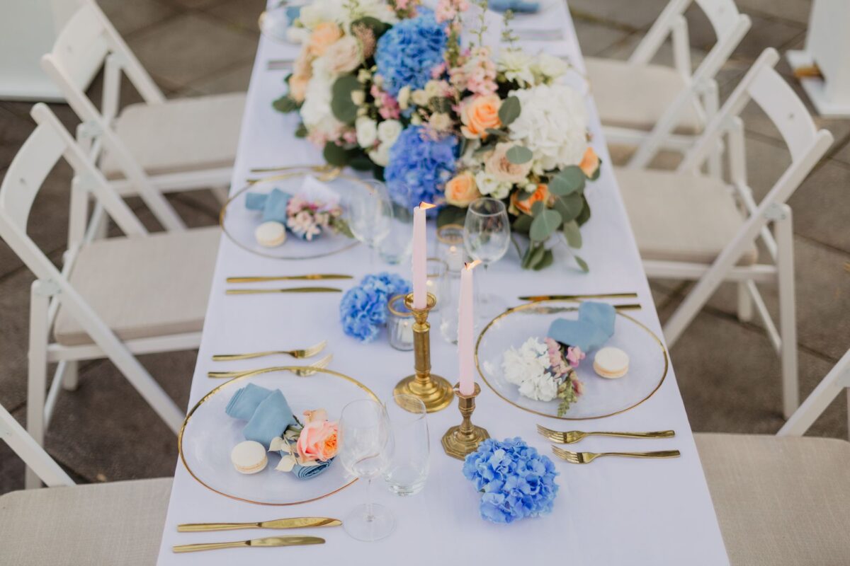 Eine Tischdekoration mit blauen und weißen Blumen.