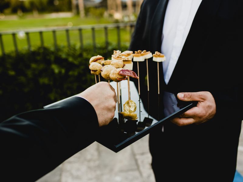 Das Essen und die Getränke machen einen großen Teil der Hochzeitskosten aus. Ein Buffet oder Menü inklusive Getränke kostet pro Person etwa 70 Euro bis 130 Euro. Für 80 Gäste sind es also zwischen 5.600 Euro und 10.400 Euro. Und auch hier: Probiert mehrere Caterer aus, um das beste Angebot zu finden.
