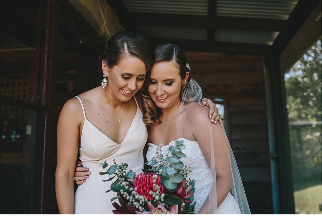 Die Braut und ihre Trauzeugin halten sich in den Armen.