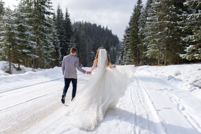 Ihr heiratet im Winter und ja, es kann kalt werden! Denkt daher als Braut darüber nach, ein wärmendes Material für das Brautkleid zu wählen, z.B. Samt oder elegante Wolle. Falls Ihr euch für ein schulterfreies  Hochzeitskleid oder ein Trägerkleid entscheidet, denkt an eine Jacke, einen Bolero, einen Schal oder eine Stola zum Überziehen. Der Bräutigam ist mit seinem Anzug ja bereits recht warm angezogen.