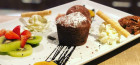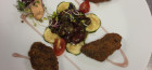 Wachtelbrust, Scampis mit Tomaten und Kräutern gebraten auf Frühlingssalat *** Lauchsüppchen mit Speck - Croutons *** Scheiben vom rosa Kalbsrücken, Protweinsoße, frisches Gemüse und Gratinkartoffeln *** Mocca Halbgefrorenes mit marinierten Beeren
