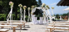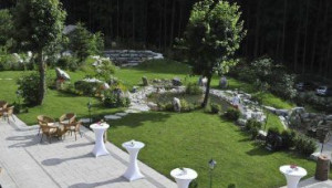 Beide Räume haben direkten Zugang zu den Terrassen und zum großen Garten, der mit Quellteich, Rosenpavillons, Feuerstelle und Weinkeller eine wunderschöne Kulisse bildet. So planen Sie Ihre Hochzeit völlig wetterunabhängig – im Zweifel bauen wir das Setting sowohl im Festsaal als auch im Außenbereich auf – denn durch das Öffnen der großen Flügeltüren werden Terrassen und Garten einfach integriert.