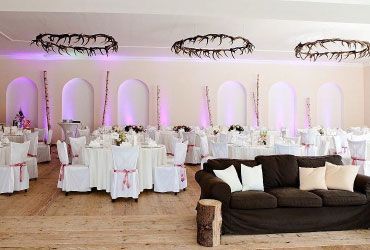 Bei uns können Sie Ihre Hochzeit mit 50 Gästen, genauso aber mit 250 Personen feiern. Die Location verfügt über zwei verschieden große Räume, die ganz nach Wunsch gestaltet, dekoriert und bestuhlt werden können. Meist wird der kleinere Raum zum Empfang und später als Lounge / Barbereich genutzt, während der große Saal den eigentlichen Veranstaltungsraum darstellt.
