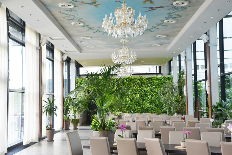 Die großzügige und lichtdurchflutete Eventhalle beeindruckt hingegen mit einem außergewöhnlichen Efeu- und Baumwall. Zusätzlich ist der direkt an den Volkspark angrenzende Wasserplatz von der Eventhalle aus zugänglich und vielseitig nutzbar: Als Sonnenterrasse, Loungebereich, BBQ Area oder versehen mit einer Barista- oder Softeisstation.