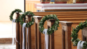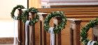 sehr schöne Dekoration in der Kirche und bei der Hochzeitsfeier / Brautpaaransteckblumen für unsere Hochzeit im Oktober