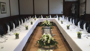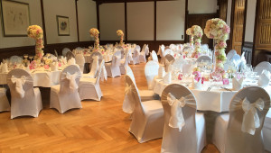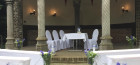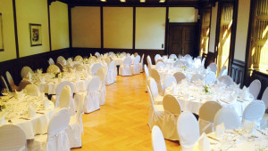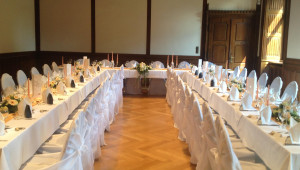 Für den Rittersaal, das Kaminzimmer und die dazugehörigen Außenbereiche, inkl. Auf- und Abbau der Möblierung, Tischtücher, Mundservietten, Stehtischhussen, Besteck, Geschirr, Gläser, Servicepersonal für 8 Stunden und Endreinigung