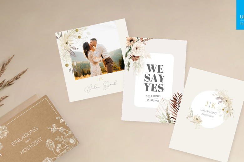 Gestalte deine Papeterie zur Hochzeit und wähle zwischen vielzähligen Vorlagen aus. Egal ob Save-the-Date,- Einladungs,- Dankeskarten, Kirchenhefte oder Menükarten - wir haben für jeden Geschmack das passende Design parat.