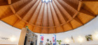 Erlebe die originale Orgel, das wunderschöne Kirchenschiff mit Tageslicht durch das Sternfenster und die bunten abstrakten Glasfenster.