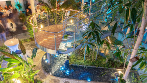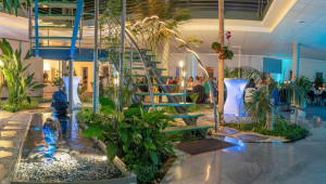 Wenn man das Besondere und das nicht alltägliche sucht, ist man bei ELO goldrichtig. Bereits beim ersten Kontakt mit dem Gebäude wird man durch das monumentale Eingangsportal herzlich willkommen geheißen. Nach dem Eintreten fasziniert die sehr offene Gestaltung und die stilvolle Glastreppe die in dem hellen Atrium nach oben führt. Ein großer, mit Plamen versetzter Innengarten, vermittelt karibisches Flair. Der Anblick der tiefblauen beleuchteten Sodalith Halbedelsteine, die den gesamten Boden des langgezogenen Wasserbeckens bedecken, zaubern durch das Wasserspiel der 3 Springbrunnen eine unbeschreibliche und fesselnde Stimmung.
