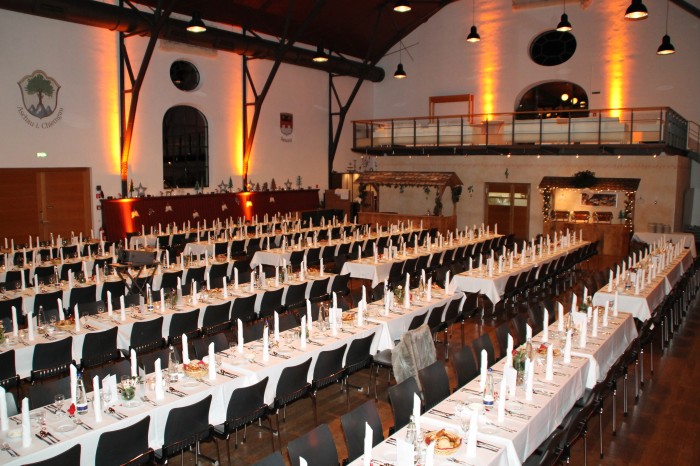 Die Festhalle bietet 120 bis 600 Personen Platz, der angebaute Wintergarten 30 bis 80, der geräumige Hallenvorplatz bis zu 2000. Parkplätze sind ausreichend vorhanden!