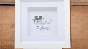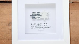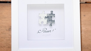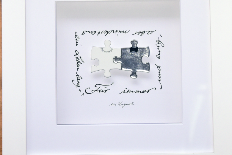 Unsere liebevoll in Handarbeit gefertigten Puzzlebilder, die symbolisch den Zusammenhalt zweier Menschen darstellen sind das perfekte Geschenk für Hochzeiten, für verliebte oder als Heiratsantrag. Eine individueller Text oder das Hochzeitsdatum machen es zu einem sehr persönlichen Geschenk. Auf der Rückseite ist genügend Platz für die Glückwünsche und eventuell einem Couvert, in dem man noch ein Geldgeschenk verpacken kann.