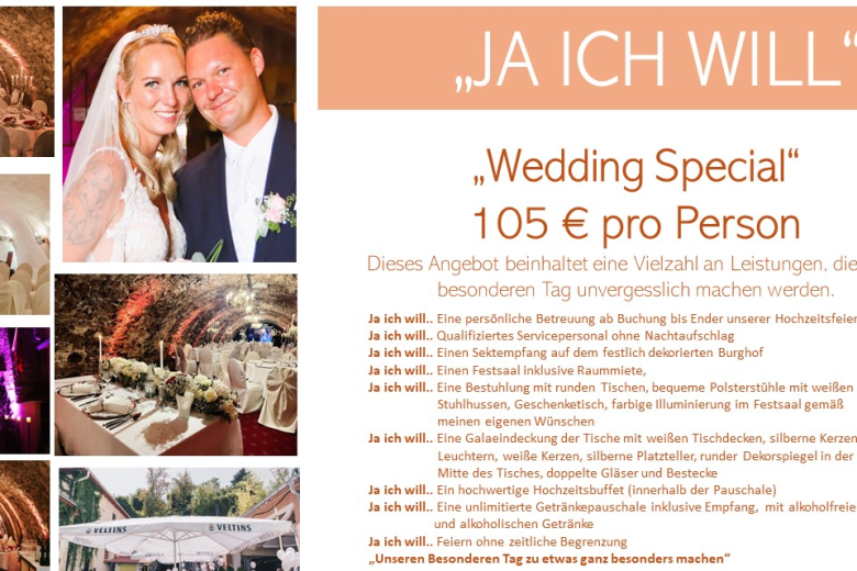 Liebe Gäste, um Ihnen die Kalkulation Ihrer Endkosten zu erleichtern, bieten wir Ihnen ein Gesamtpaket pro Person an. Die Zusammenstellung und Kalkulation des Paketes erfolgt nach Ihren eigenen Wünschen und Vorstellungen. Die Preise für unsere Pauschalangebote beginnen bei ca. 120 EUR pro Person. Darin inbegriffen sind folgende Leistungen persönliche Betreuung vor- und während der Veranstaltung eigener Festsaal und Empfangsbereich kostenfreie Nutzung des Trausaales (auf Wunsch) qualifiziertes Fachpersonal OHNE Nachtaufschlag Standardeindeckung der Tische Standardbestuhlung der Säle Sektempfang Getränkepauschale ab Einlass in den Festsaal ohne zeitliche Begrenzung Raummiete Wunschbüffet unbegrenztes Zeitlimit der Feier