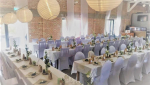 Für die besondere Atmosphäre innerhalb der Location sorgen hohe Decken, romantisches Fachwerk und ein großer, lichtdurchfluteter Saal im modernen Industrie-Look.