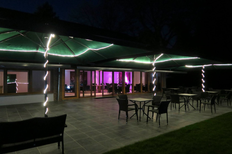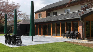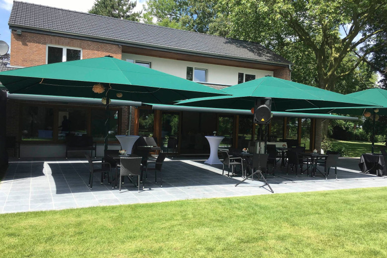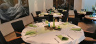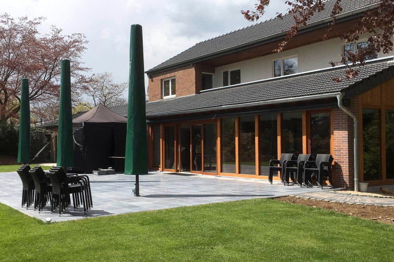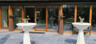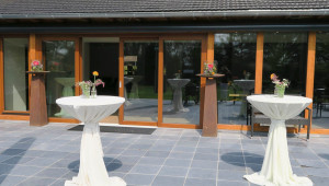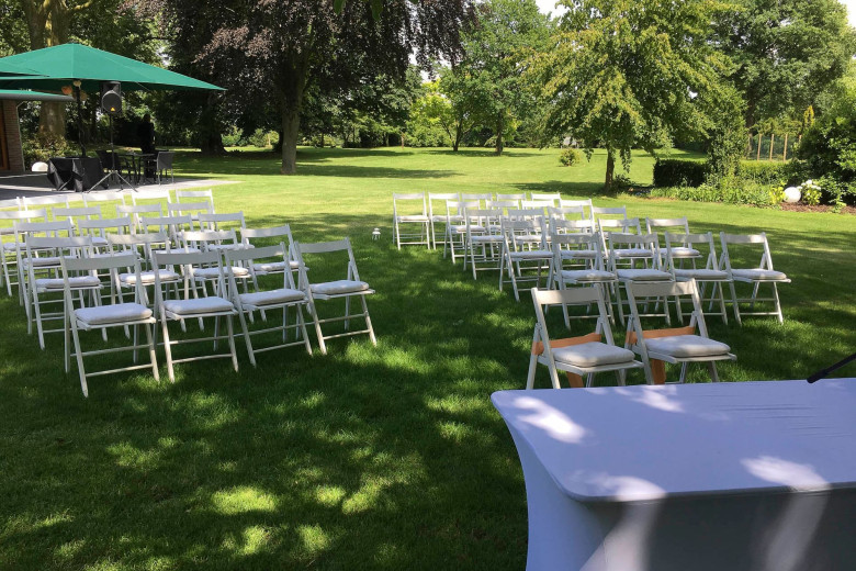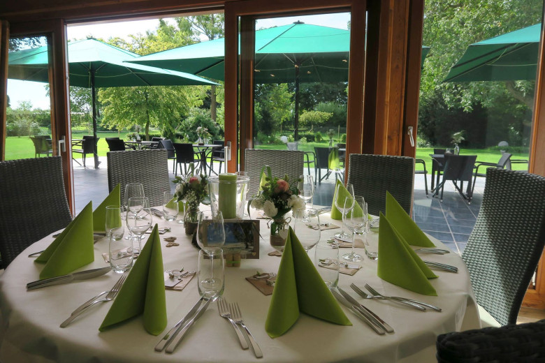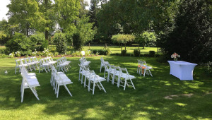 Ein besonderes Highlight dieser Räumlichkeit, ist die große Sonnenterrasse im eigenen Garten. Durch die große Fensterfront wirkt das Ambiente besonders freundlich und offen uns sorgt schnell für ein wohliges „Zuhause-Gefühl“. Die 100 Jahre alten Eichen- und Nussbäume sorgen für eine zusätzliche traumhafte Kulisse für freie Trauungen.