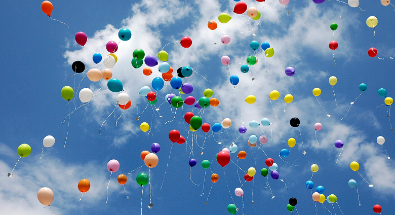 Mit Helium gefüllten Ballons und/oder Blumen.