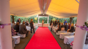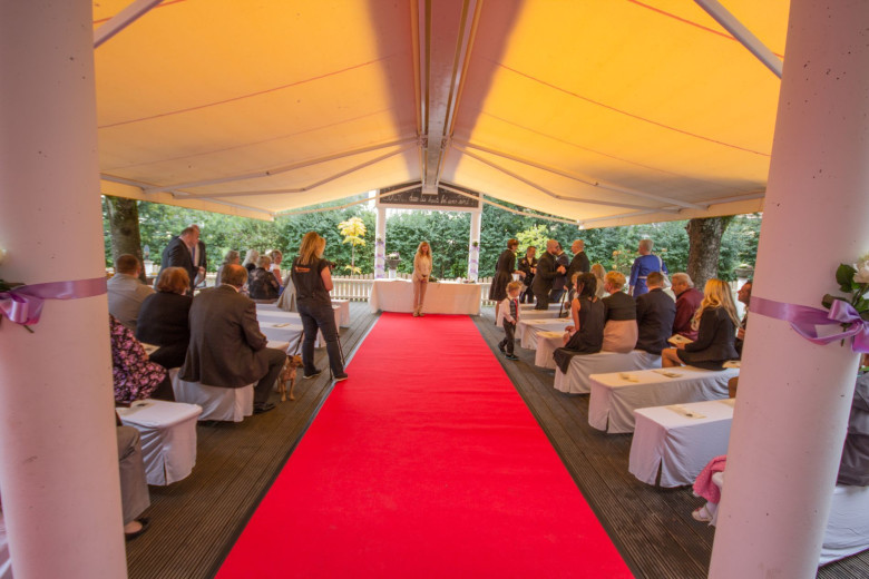 Du stehst mit deiner Liebsten oder deinem Liebsten in einem wunderschönen Garten inmitten von Bäumen unter einem geschmückten Pavillion. Euer Trauredner spricht über eure Liebe und wie ihr euch eure gemeinsame Zukunft vorstellt. Er bringt zum Ausdruck, was ihr aneinander schätzt und wie wunderbar ihr euch ergänzt.