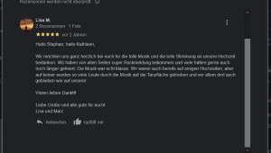 Hallo Stephan, hallo Kathleen, Wir möchten uns ganz herzlich bei euch für die tolle Musik und die tolle Stimmung an unsere Hochzeit bedanken. Wir haben von allen Seiten super Rückmeldung bekommen und viele hätten gerne auch noch länger gefeiert. Die Musik war echt klasse. Wir waren auch bereits auf einigen Hochzeiten, aber auf keiner wurden so viele Leute durch die Musik auf die Tanzfläche getrieben und vor allem dort auch geblieben wie auf unserer. Vielen lieben Dank!!! Liebe Grüße und alle gute für euch! Lisa und Marc