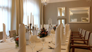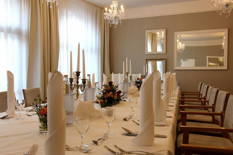 Spiegel an den Wänden, runde Tische unter Kronleuchtern, so lädt unser Bankettraum Sie zu Ihren Feierlichkeiten ein.