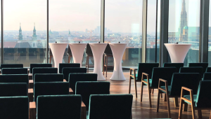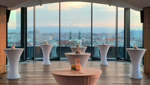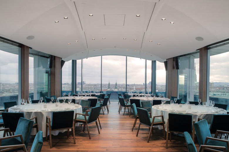 Die gesamte Location beeindruckt durch einen grandiosen Weitblick über die Dächer Wiens und der Hauptraum bietet eine einzigartige Sicht auf den Stephansdom und das Stadtzentrum bis zu den Hausbergen der Stadt.