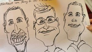 alle Gäste fanden die Idee der Karikatur sehr besonders. Tristan fängt die Eigenarten des menschlichen Gesichtes sehr gut ein; alle haben sich wiedererkannt, die meisten fanden es total lustig, ein paar ganz wenige wären lieber hübscher -aber dafür kann Tristan nichts.